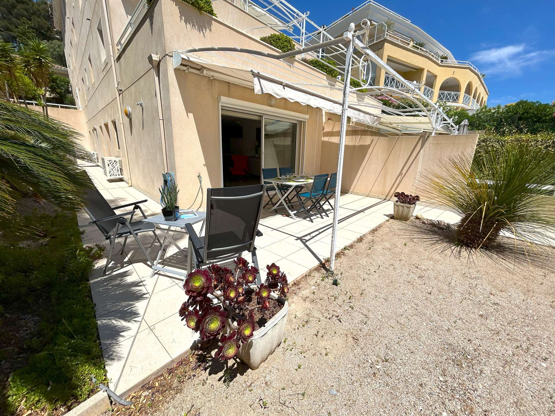 SANARY PORTISSOL PIEDS DANS l’EAU- Bel appartement Type 3 pour 4 personnes. Vous disposez d'un jardin et d'une terrasse de 100 m2 avec une belle vue mer.