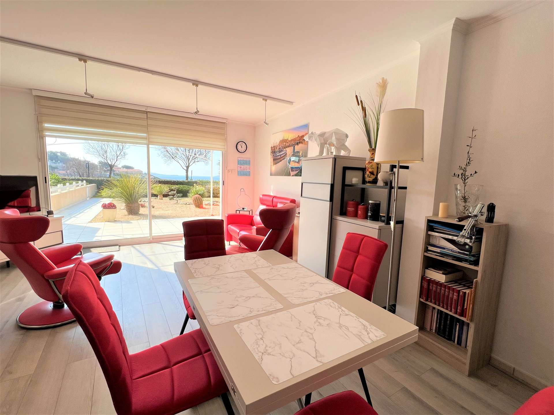 L'appartement de 75m² se compose d'une cuisine entièrement équipée, d'un grand séjour - salle à manger le tout s'ouvrant sur une belle terrasse aménagée et son jardin face à la mer. Climatisation. wifi.