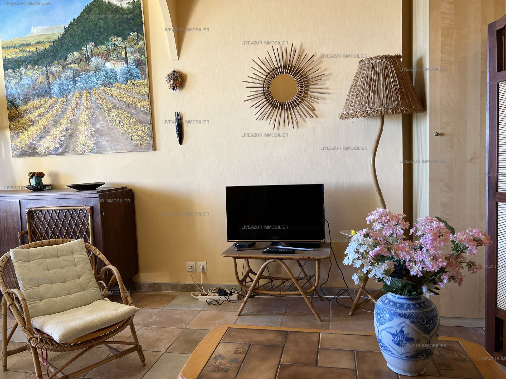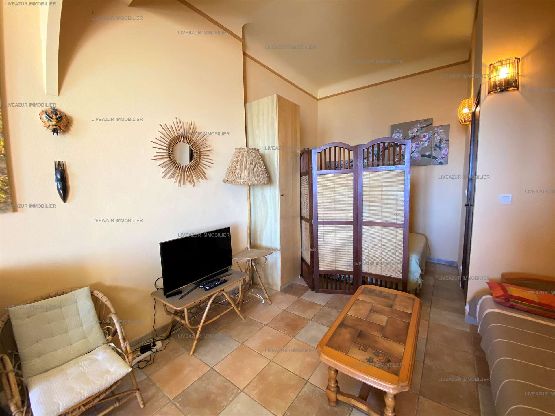 L'appartement, situé dans un cadre idyllique, se trouve au Rdc surélevé de cette résidence calme et sécurisée. Il est composé d'une entrée, d'une pièce à vivre avec un espace salle à manger et le salon, le tout donnant sur une terrasse vue mer. Une cuisine indépendante très bien équipée, une salle d'eau et un Wc indépendant. L'espace nuit est composé d'une chambre avec un lit double 140 cm, et un coin nuit aménagé dans le salon avec un lit double 140 cm ainsi qu'un lit simple 90 cm.