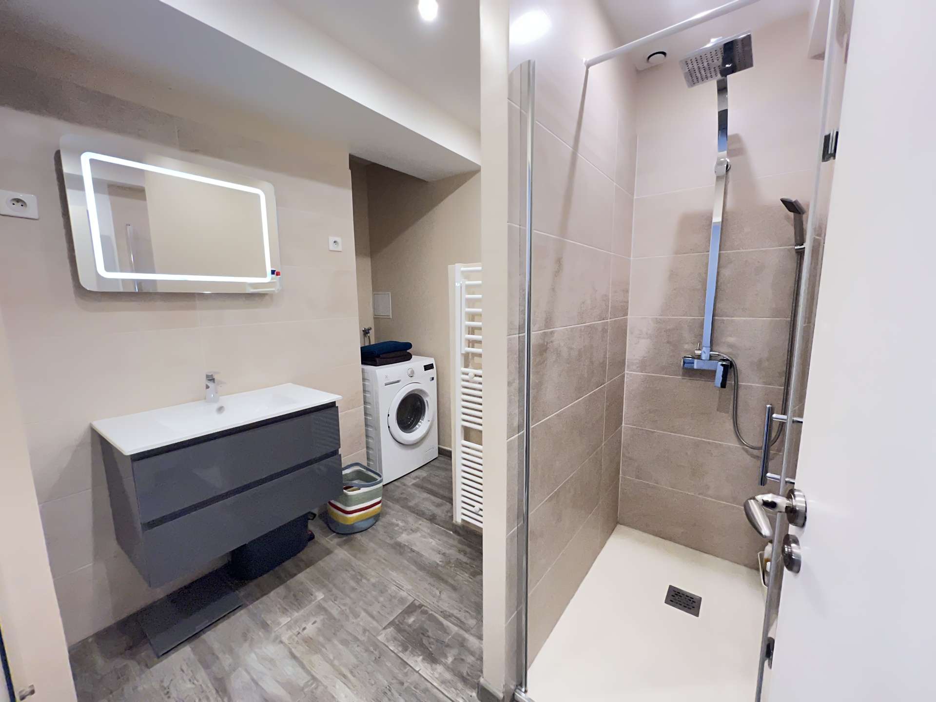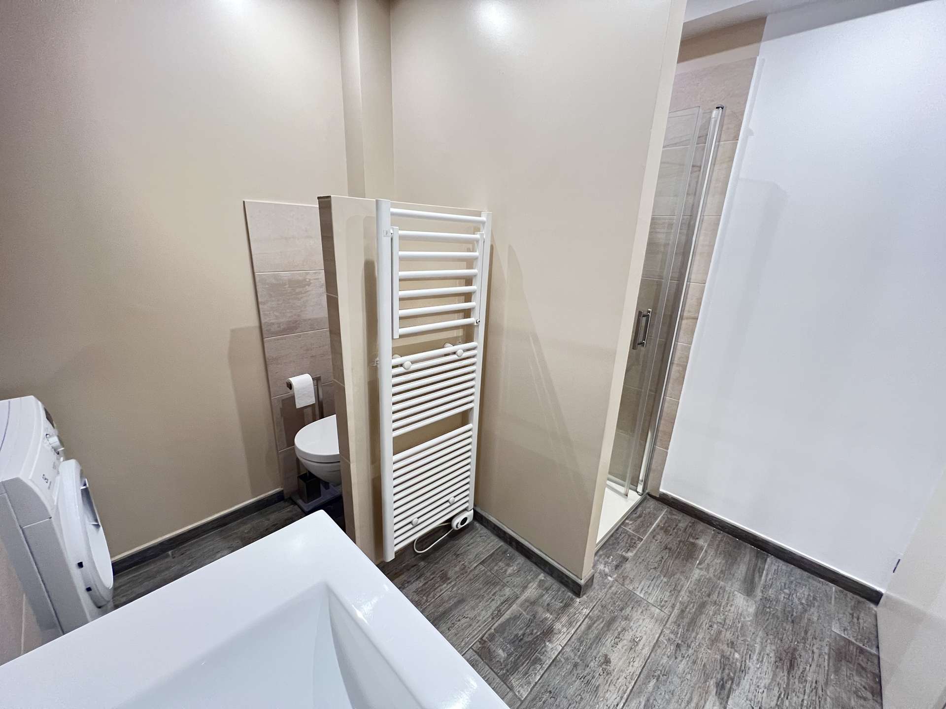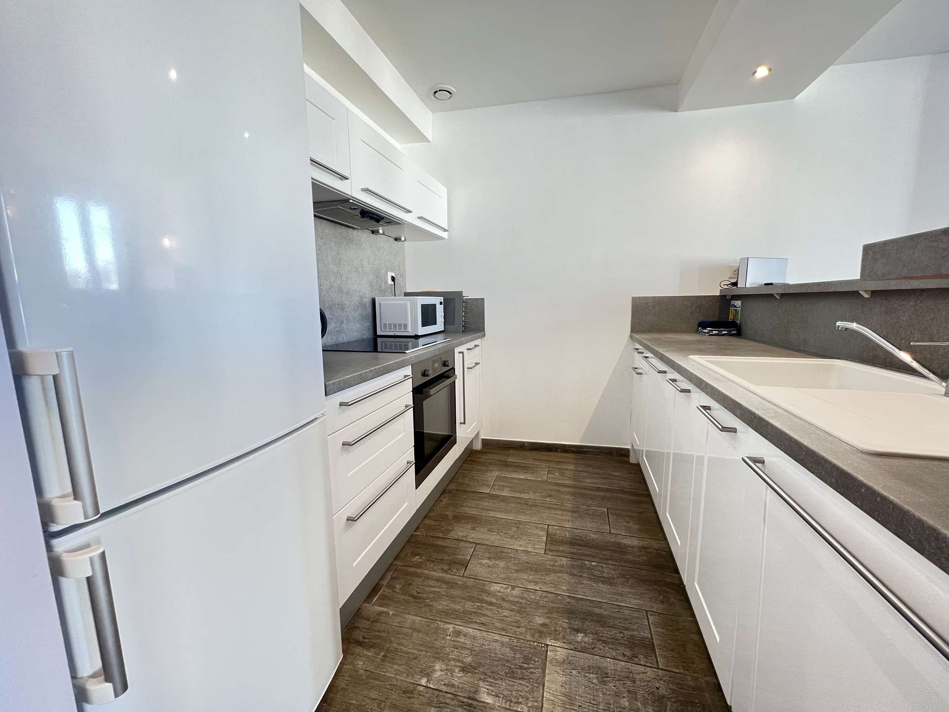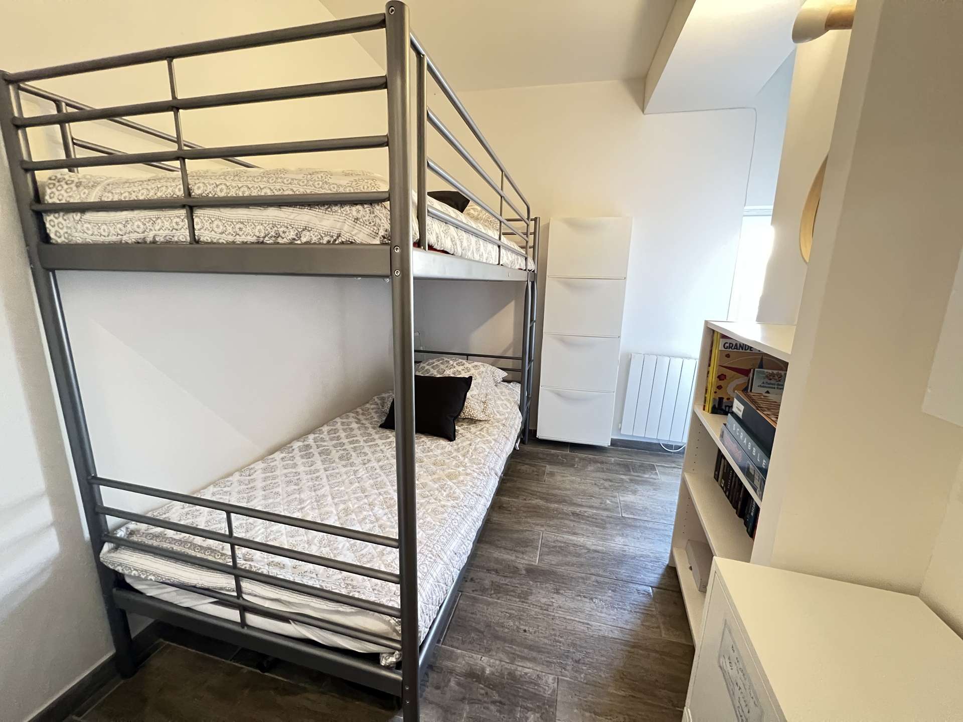 De plus, vous trouverez, un coin nuit avec un lit double en 160, une chambre à coucher pour 2 avec lits superposés en 90 ainsi qu'une salle d'eau avec douche, WC et lave linge.