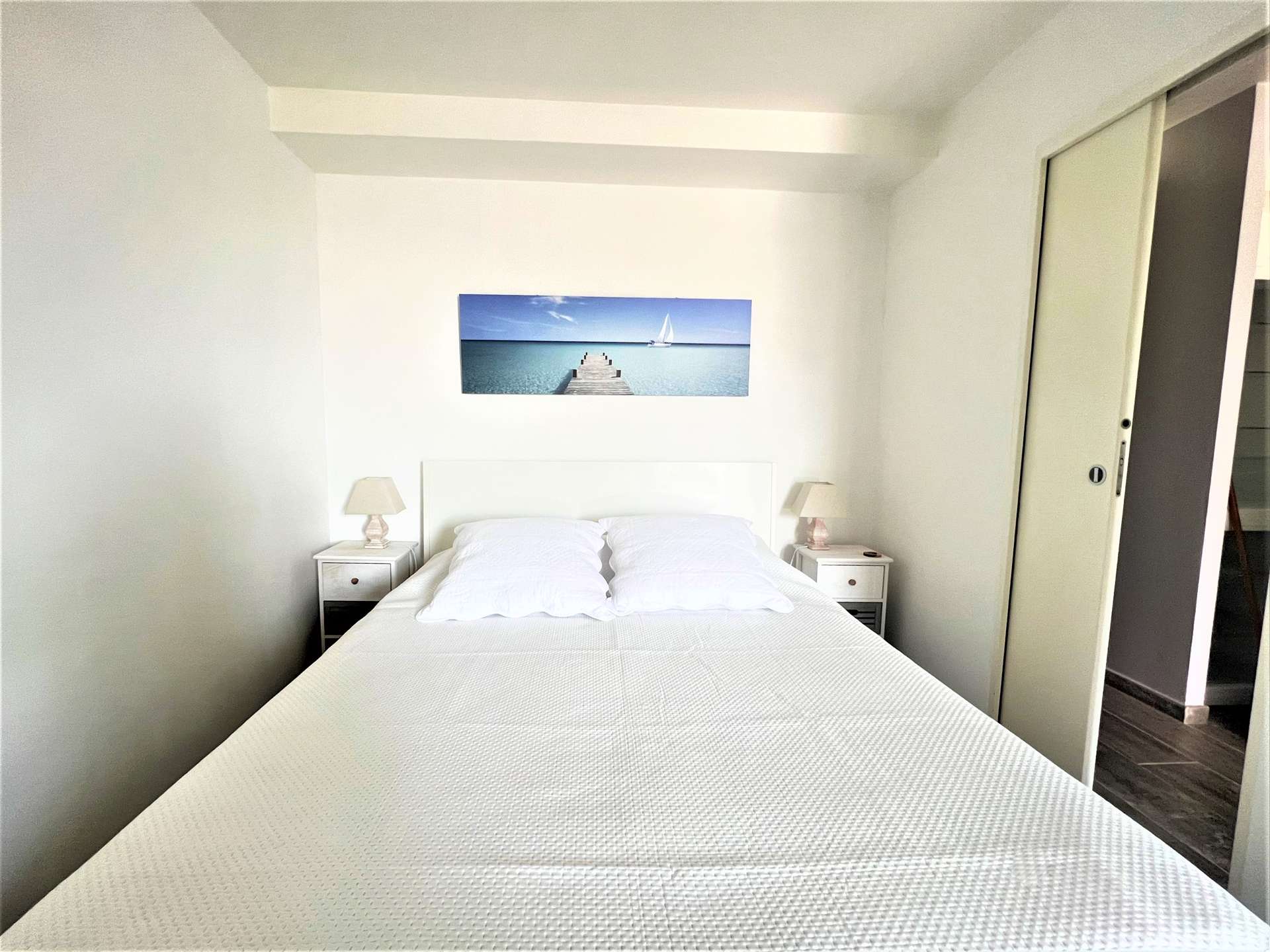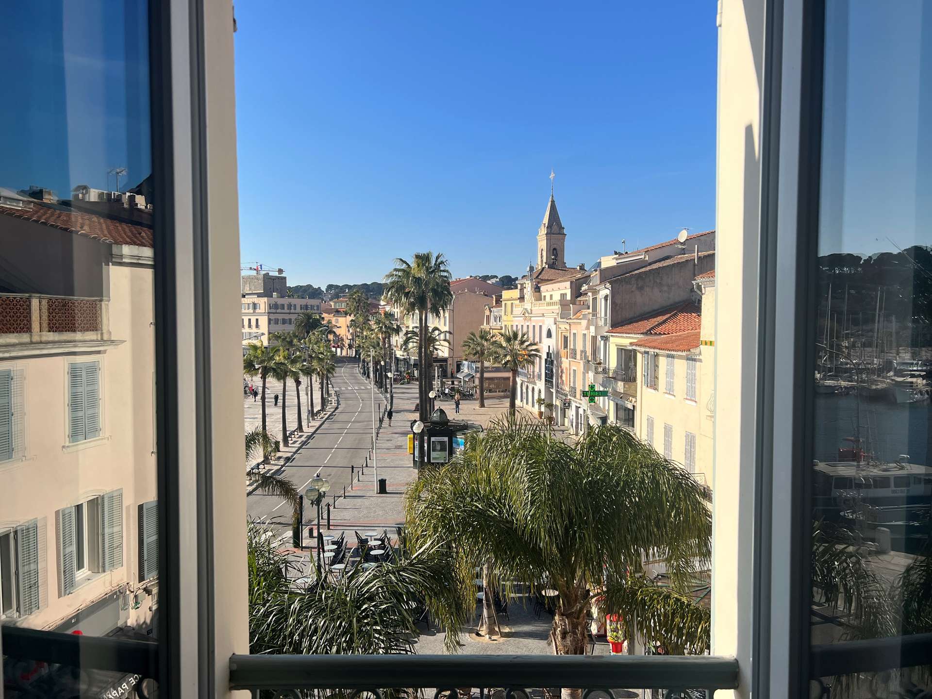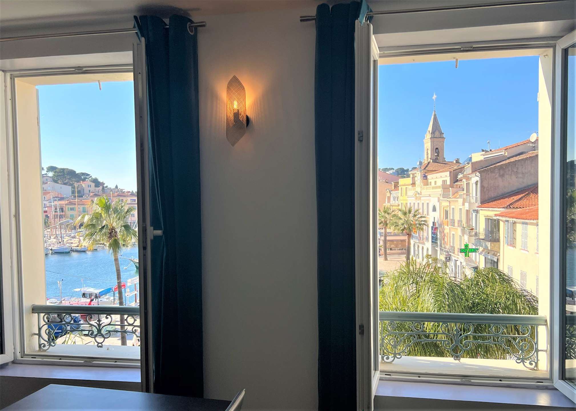 L’appartement se compose d’un séjour/salle à manger ainsi qu’une cuisine américaine ouverte très bien équipée, avec une vue sur le port de Sanary et l'église.
