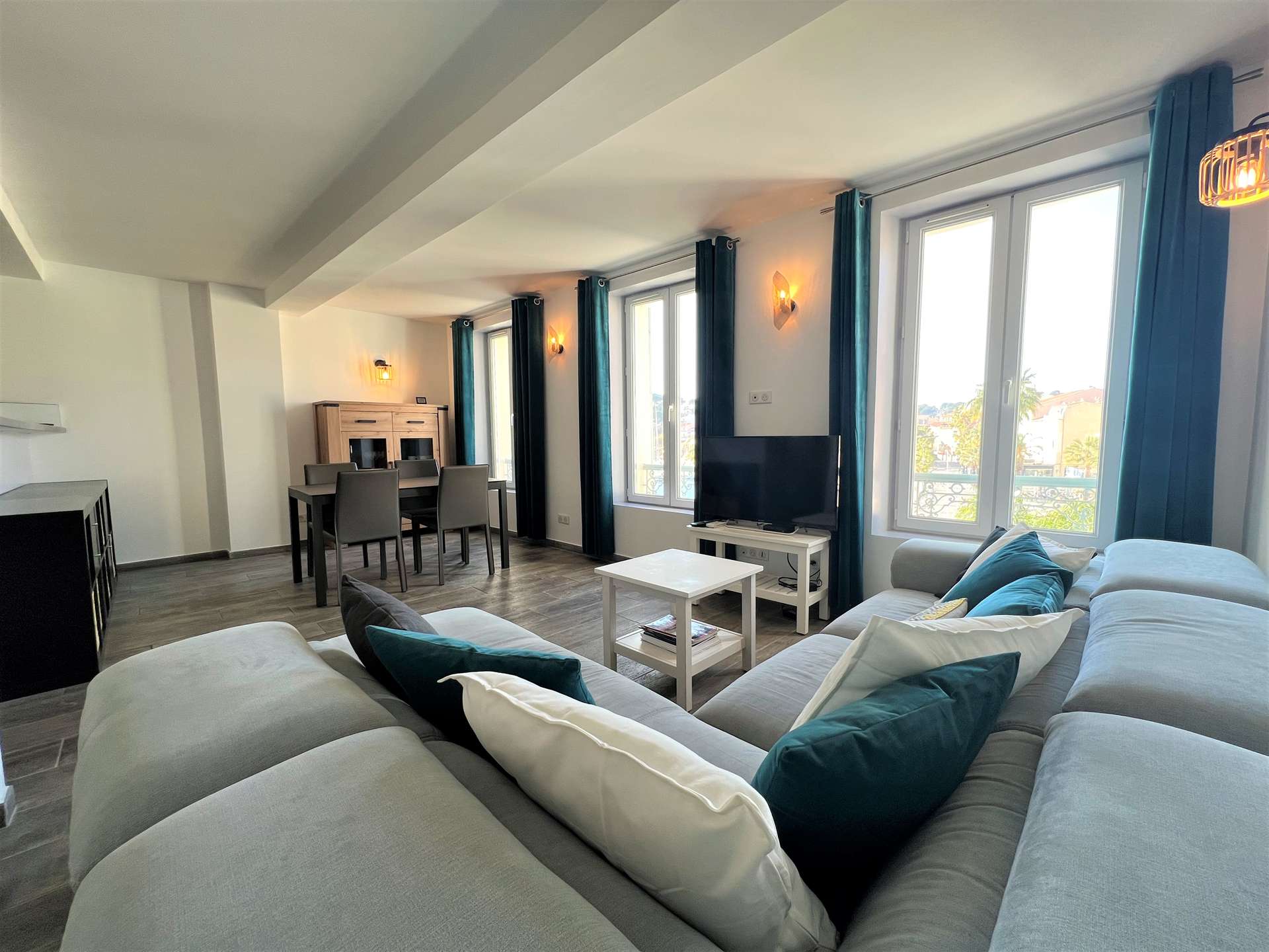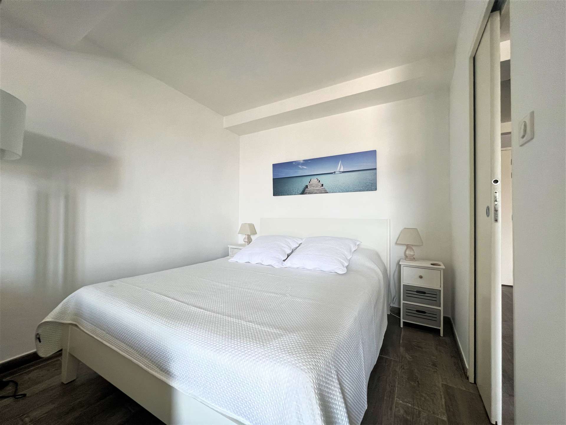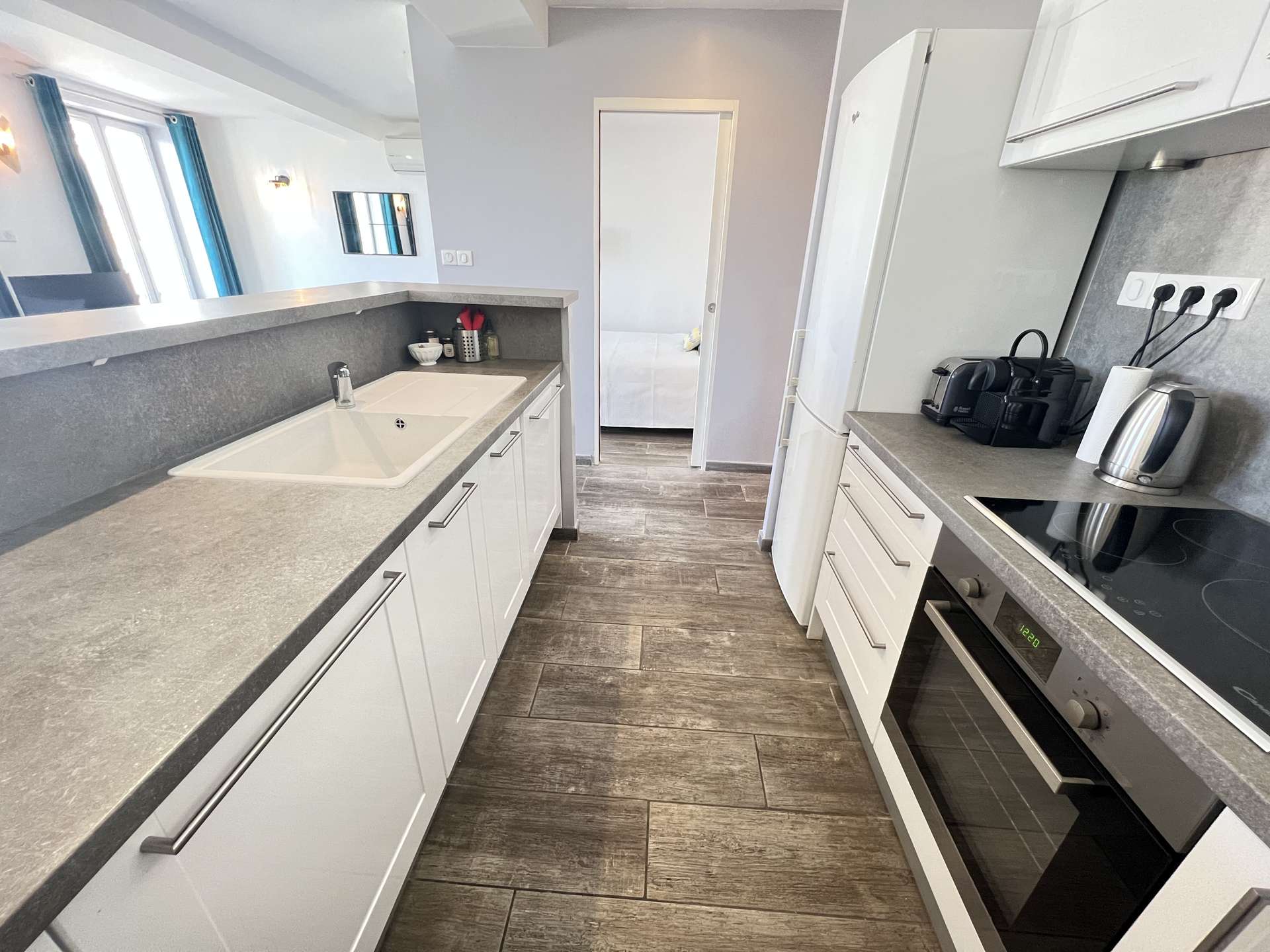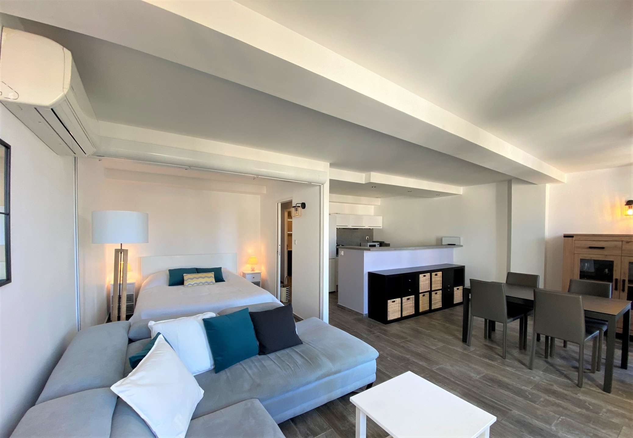 L’appartement se compose d’un séjour/salle à manger ainsi qu’une cuisine américaine ouverte très bien équipée, avec une vue sur le port de Sanary et l'église.