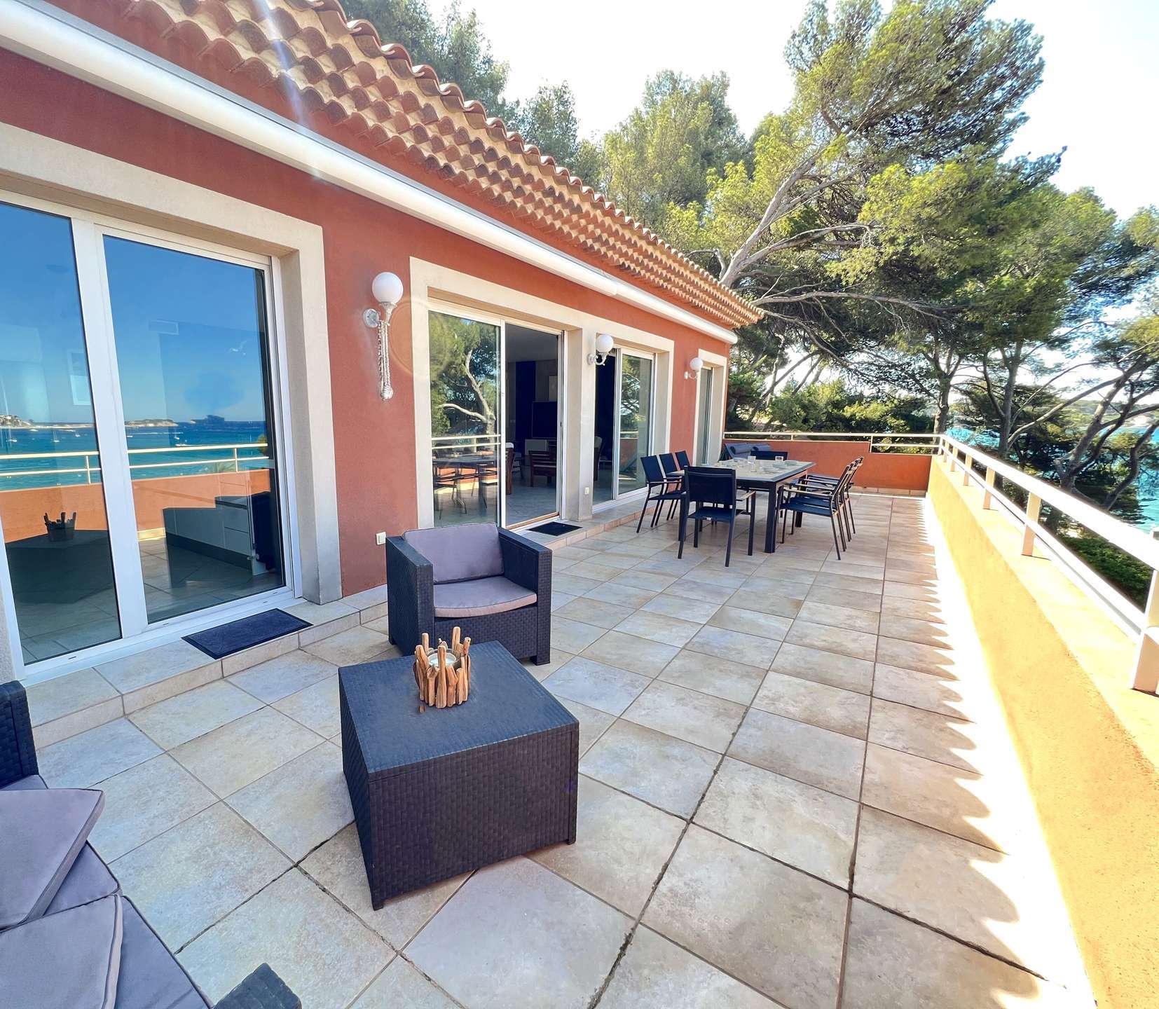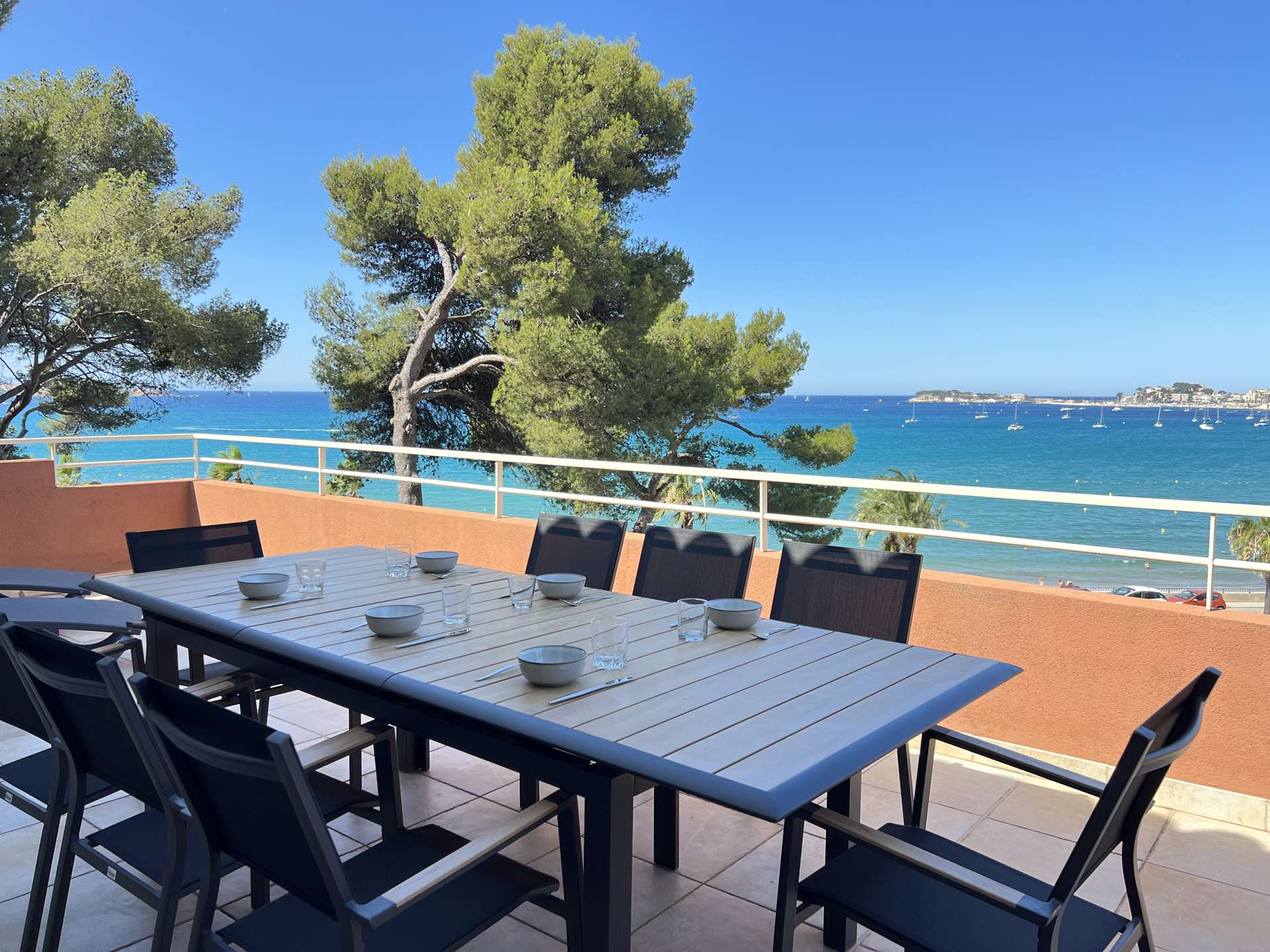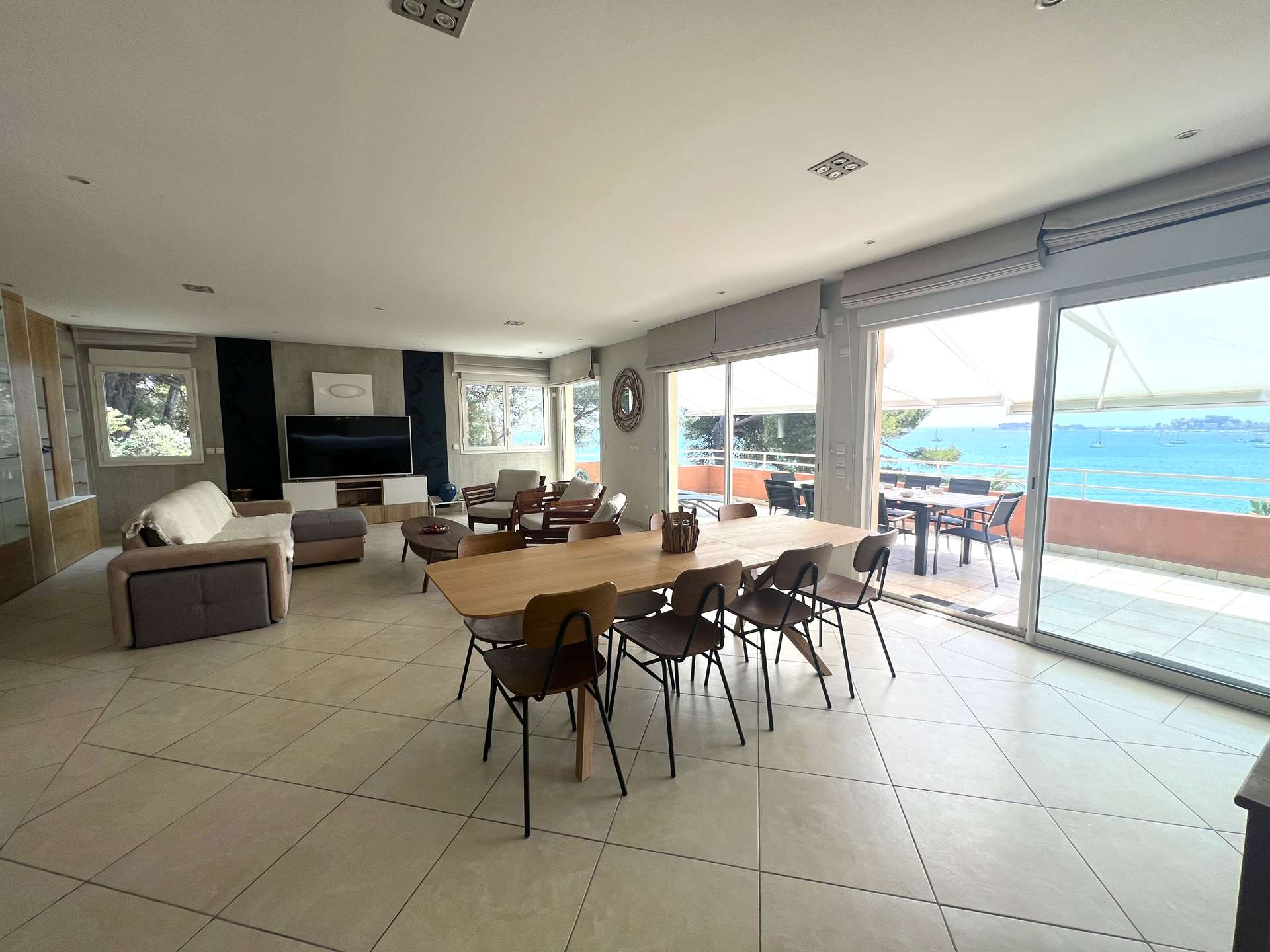 L'appartement se compose d'un salon TV/séjour avec cuisine ouverte totalement équipée donnant sur une très belle terrasse face à la mer.