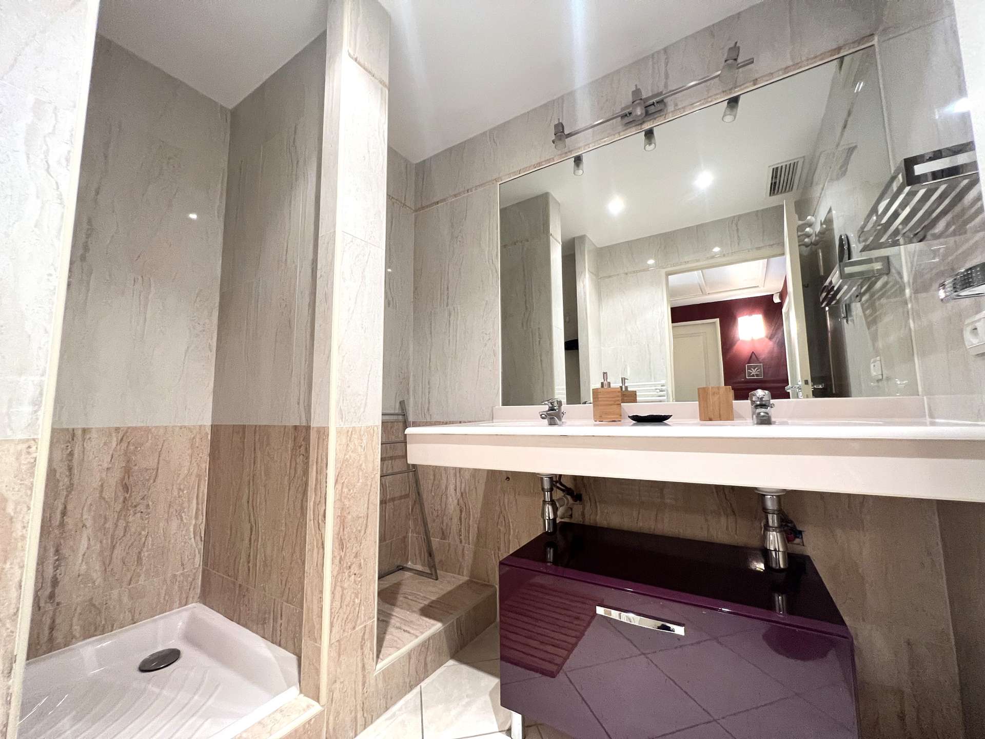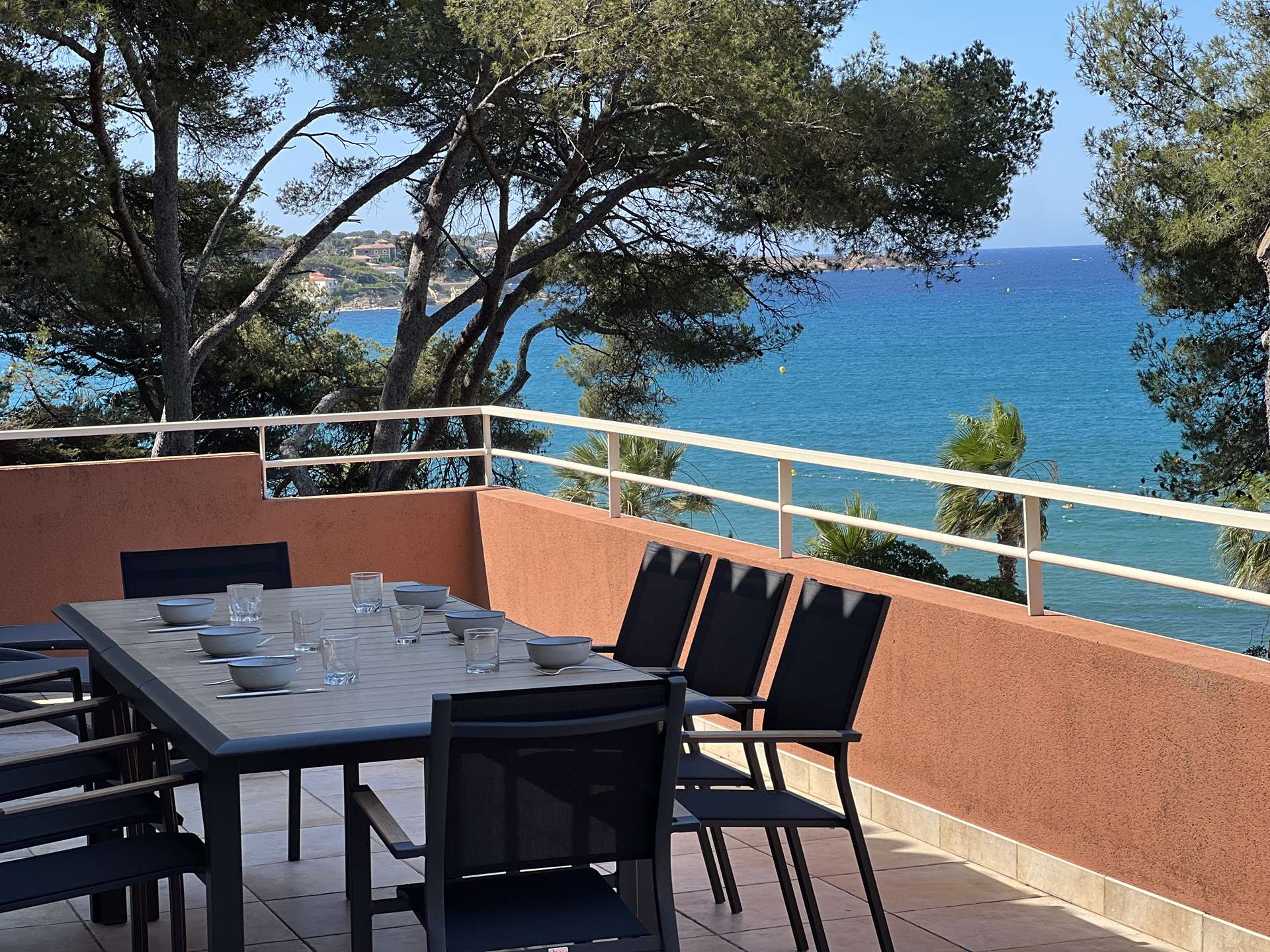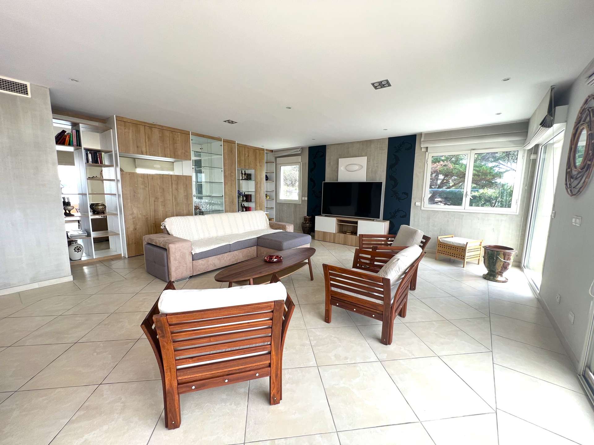 L'appartement se compose d'un salon TV/séjour avec cuisine ouverte totalement équipée donnant sur une très belle terrasse face à la mer.