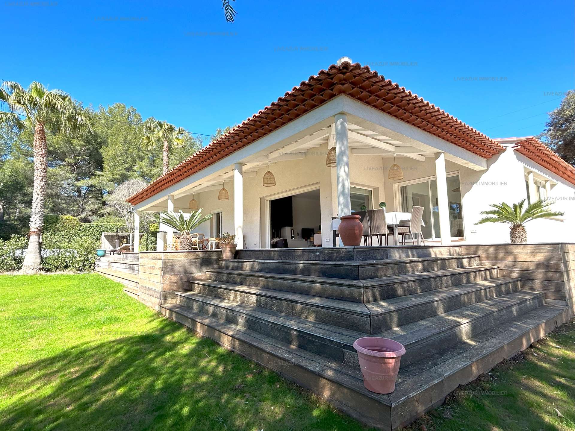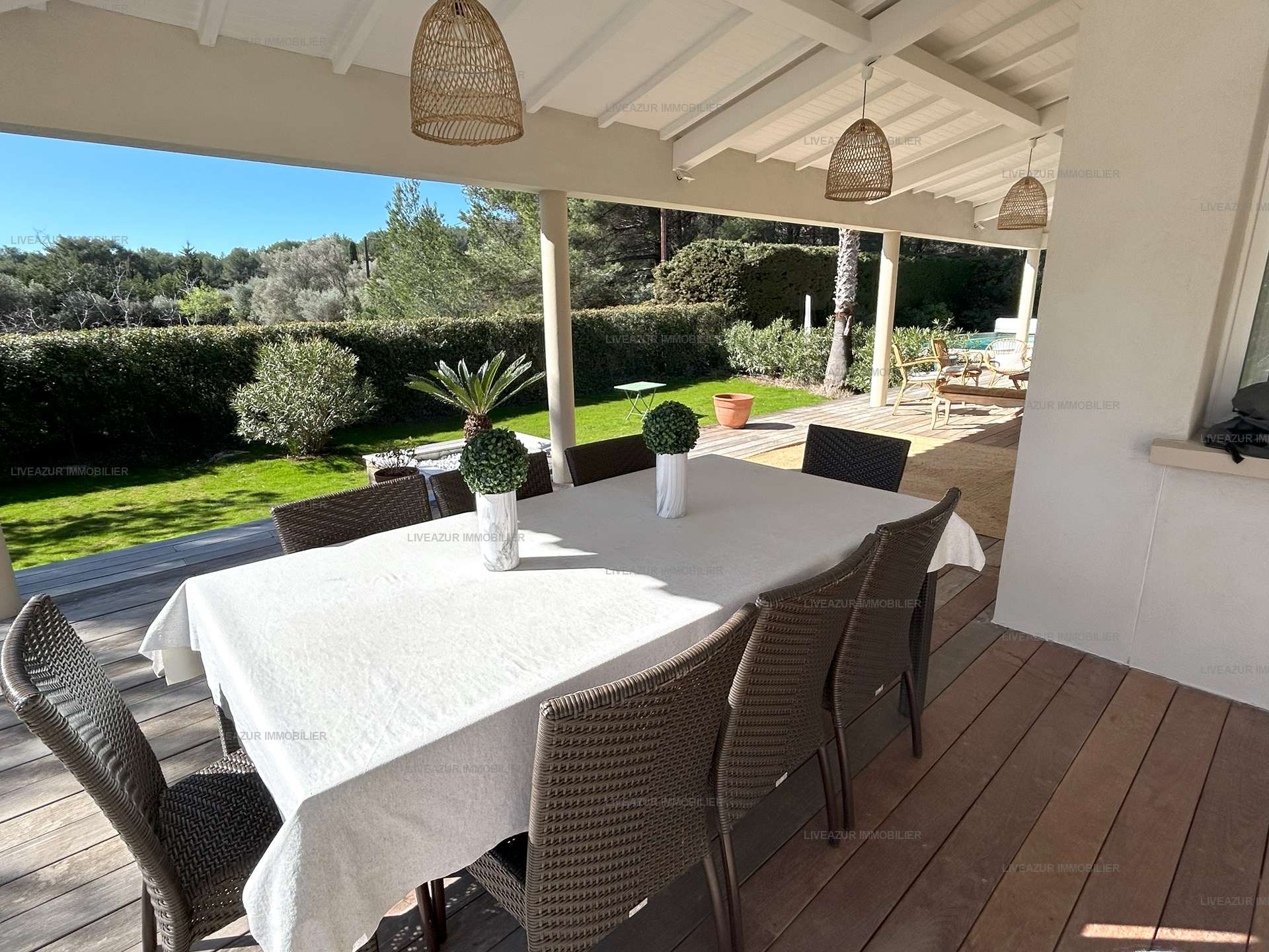 Cette propriété est à 10 minutes seulement en voiture du port et des plages de Sanary, se compose d'une entrée, d'un grand séjour/salle à manger s'ouvrant sur une grande pergola et la piscine.
