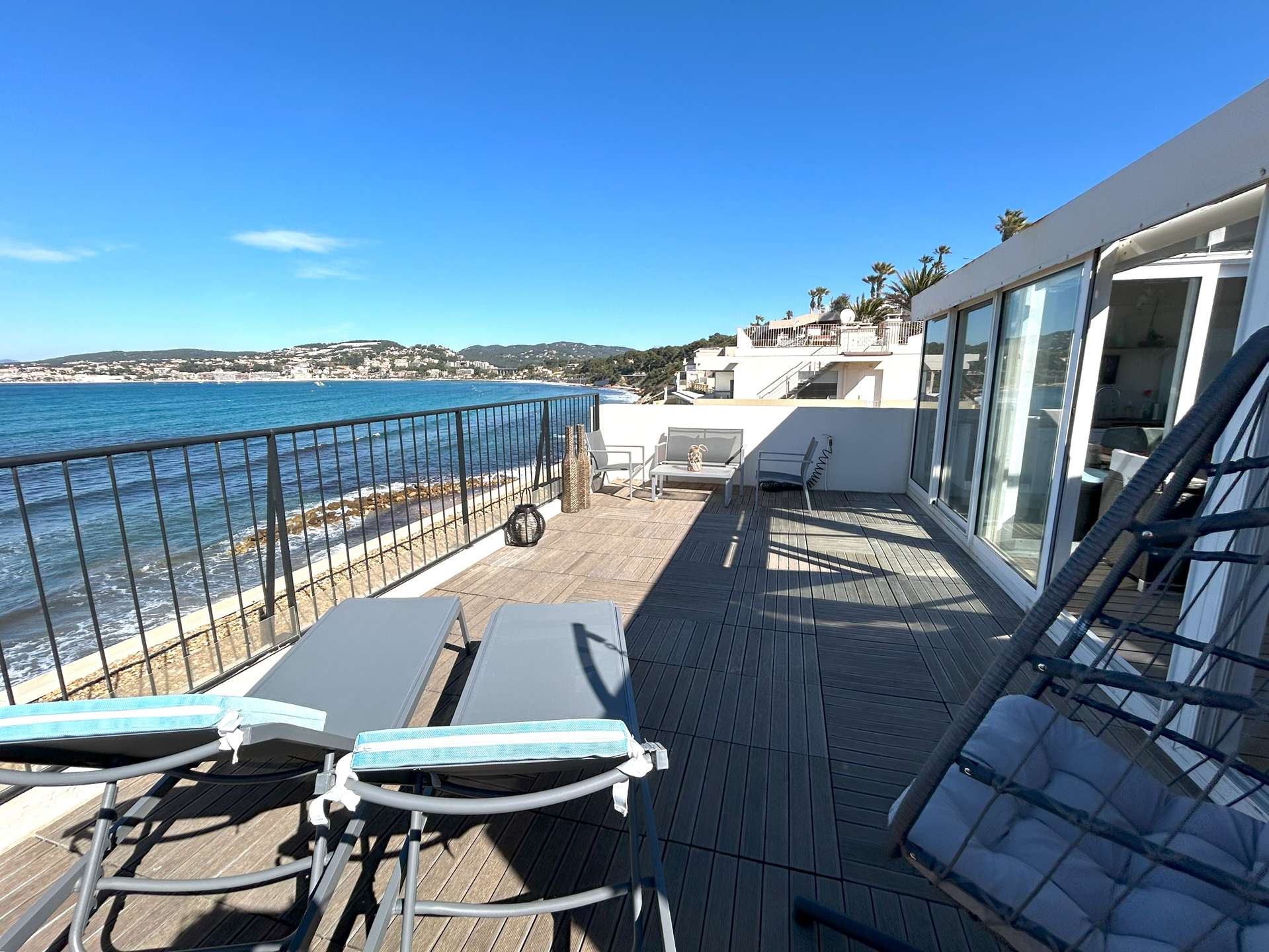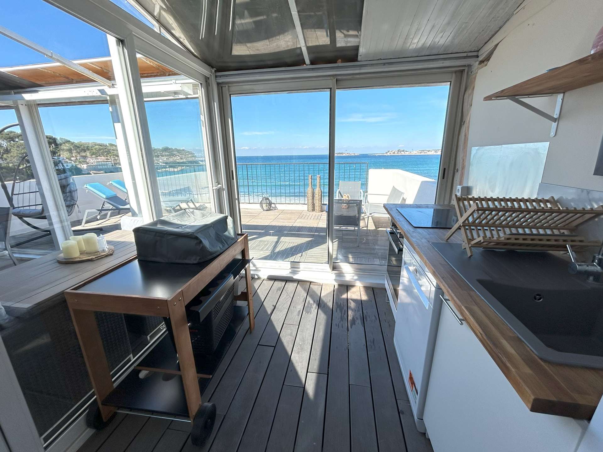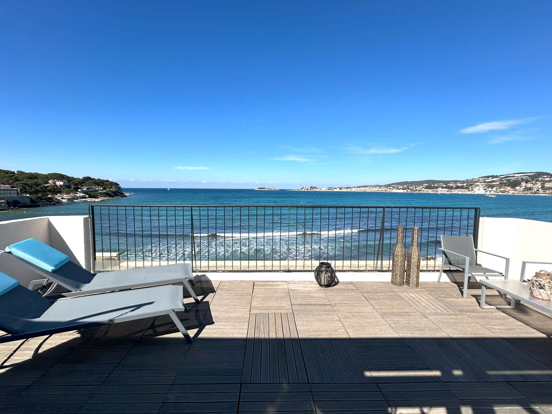SANARY PIEDS DANS l’EAU- Appartement atypique Type 3 pour 5 personnes. Face à la mer, vous disposez d'une vue panoramique imprenable et d'une grande terrasse !