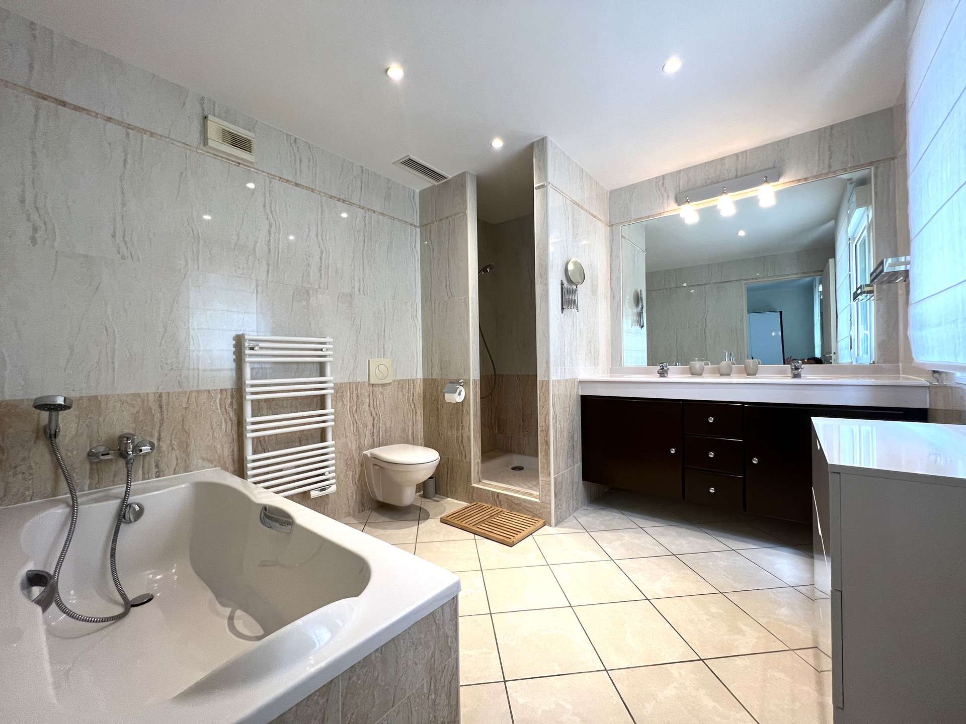 Coté nuit, une chambre parentale (lit double 160*200) possède sa propre salle de bain avec douche. Les deux autres chambres (l'une avec un lit double 140*200 et l'autre avec un lit double 160*200) partagent la même salle d'eau avec douche.